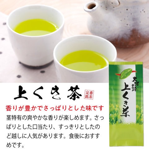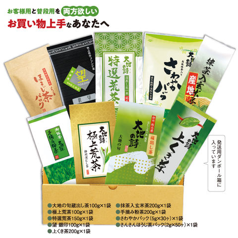内容:大地の旬蔵出し茶100g×1袋、極上荒茶100g×1袋、特選荒茶150g×1袋、望銀印100g×1袋、上くき茶200g×1袋、抹茶入玄米茶200g×1袋、さわやかパック(5g×30ヶ入)×1袋、さんさんほうじ茶パック(2g×50ヶ)×1袋、手摘み粉茶200g×1袋