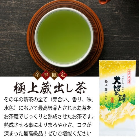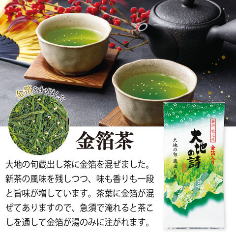 内容:極上蔵出し茶100g×1袋、初摘蔵出し茶100g×1袋、大地の旬蔵出し茶100g×1袋、大地の旬蔵出し茶金箔入80g×1袋、蔵出茶荒茶 生粋・生100g×1袋、望金印100g×1袋、特選荒茶150g×1袋、上くき茶200g×1袋、寿し茶400g×1袋