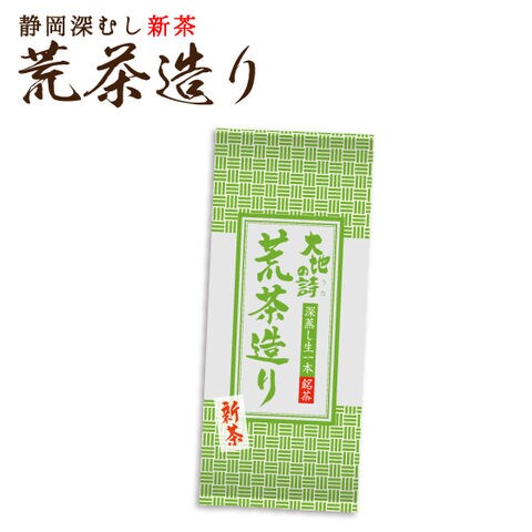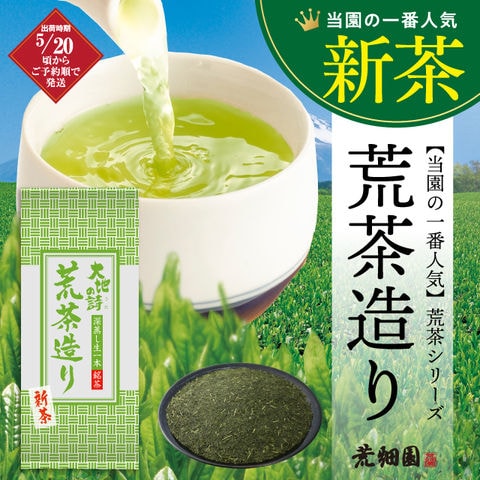 荒茶造りは、新芽が15cm位まで 育った栄養分たっぷりの新芽を、一芯五葉で 摘み取ります。立派に育った新芽は揉み上げると、お茶らしい渋味が出て、この渋味がお茶の甘みをさらに引き立たせる。ちょっと渋いお茶が好きな方にはぴったり。また、たっぷり飲まれるご家庭用や会社用などに人気の商品です。
