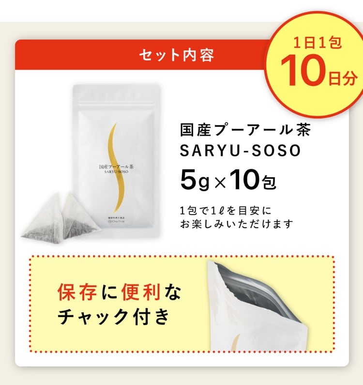 ダイエット茶 健康茶 プーアル茶 ティーバッグ 機能性表示食品 国産プーアール茶 SARYU-SOSO 5g×10包入