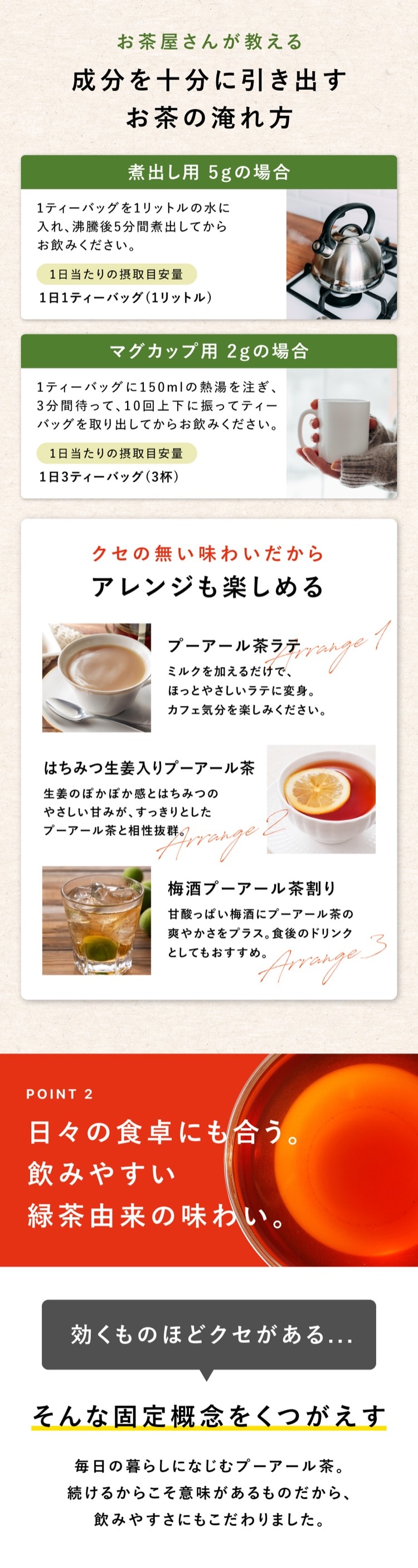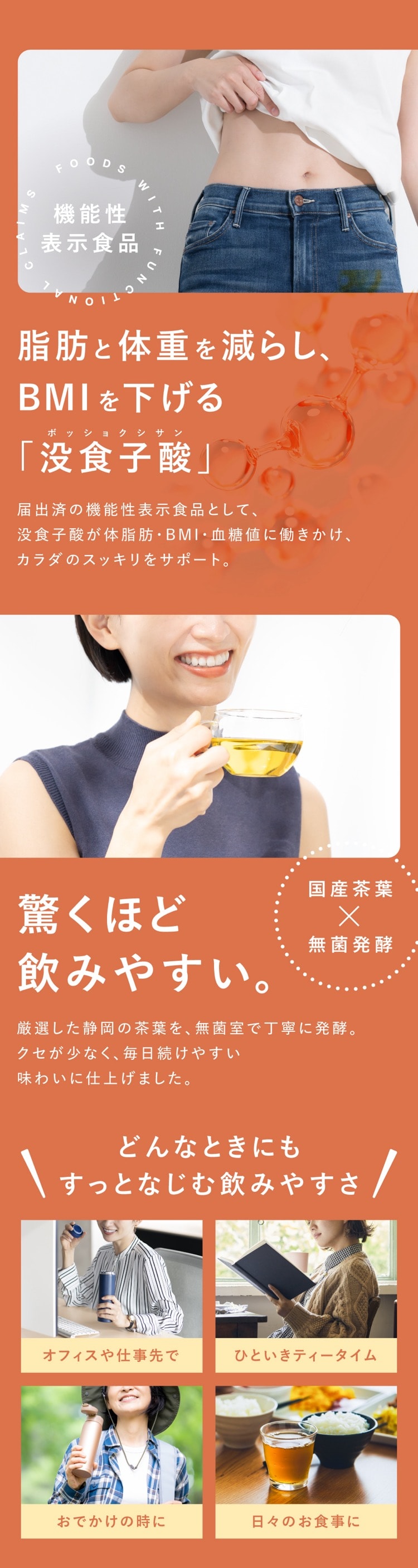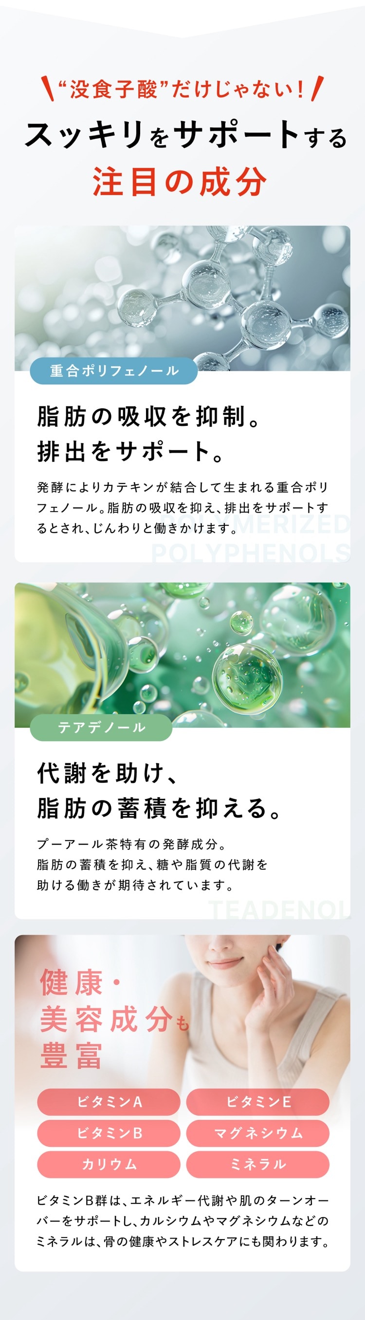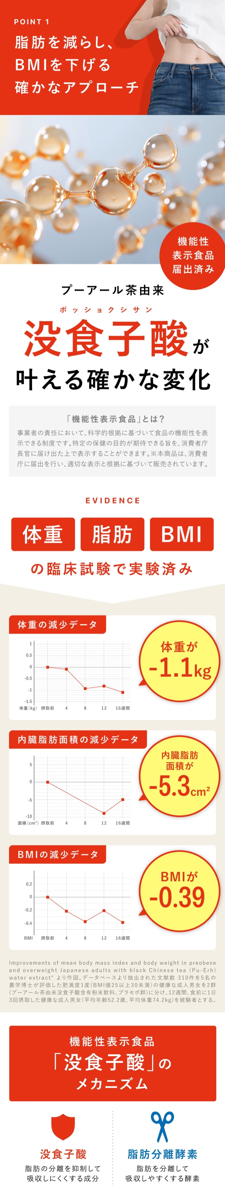 肥満気味の方の体重や内臓脂肪を減らし、高めのBMIを低下させる有効成分(プーアール茶由来没食子酸)が豊富に含まれています。