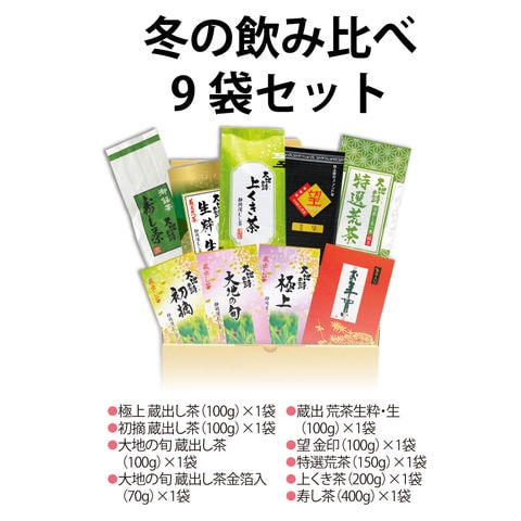 【内容】極上蔵出し茶100g×1袋、初摘蔵出し茶100g×1袋、大地の旬蔵出し茶100g×1袋、大地の旬蔵出し茶金箔入70g×1袋、蔵出荒茶 生粋・生100g×1袋、望金印100g×1袋、特選荒茶150g×1袋、上くき茶100g×1袋、寿し茶400g×1袋