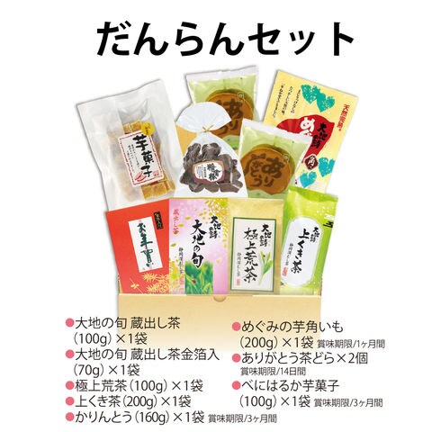 【内容】大地の旬蔵出し茶100g×1袋、大地の旬蔵出し茶金箔入70g×1袋、極上荒茶100g×1袋、上くき茶200g×1袋、しっとりかりんとう160g×1袋、めぐみの芋角いも200g×1袋、ありがとう茶どら×2個、べにはるか芋菓子130g×1袋