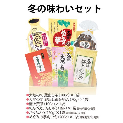 【内容】大地の旬蔵出し茶100g×1袋、大地の旬蔵出し茶金箔入70g×1袋、極上荒茶100g×1袋、のんべえまんじゅう(16包入)×1袋、しっとりかりんとう160g×1袋、めぐみの芋角いも200g×1袋
