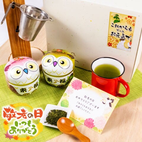 敬老の日 プレゼント お茶 緑茶 ギフト 茶こし&ふくろう缶(静岡緑茶)セット 茶さじ付き ※9/9頃より順次発送