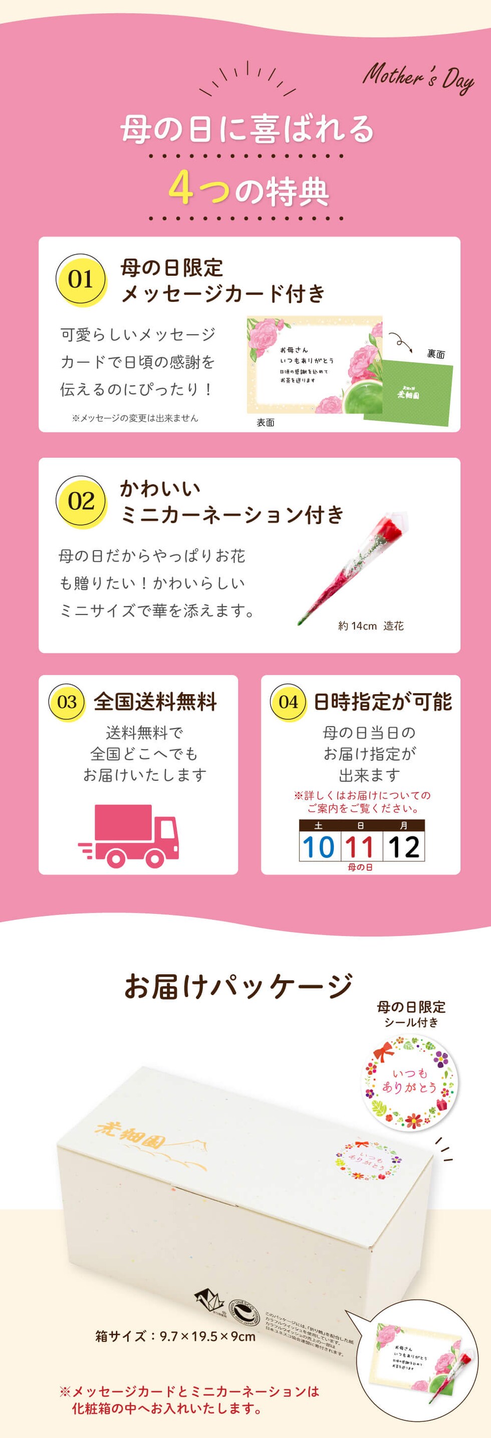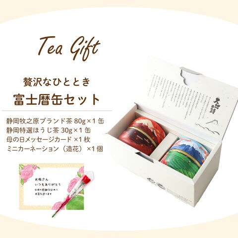 【内容】静岡牧之原ブランド茶80g×1缶、特選ほうじ茶30g×1缶、母の日メッセージカード×1枚、ミニカーネーション(造花)×1個