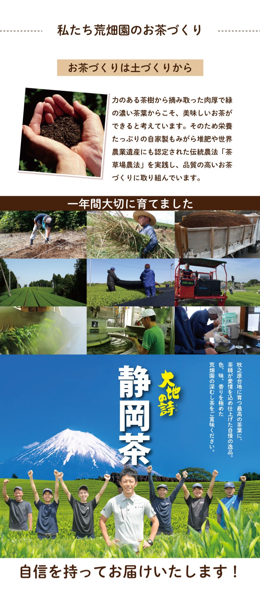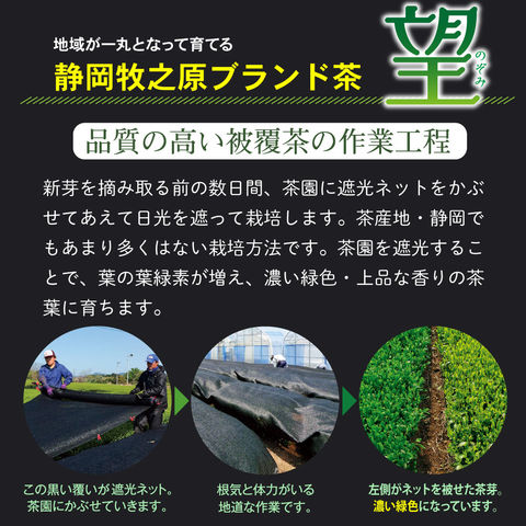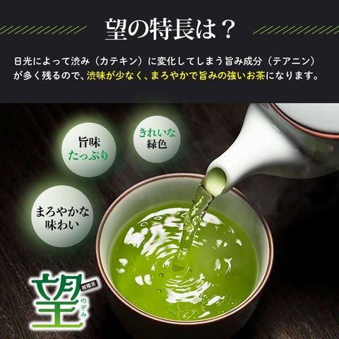 旨み成分の「テアニン」が多いので渋味が少なくまろやかで旨みの強いお茶です。被覆して栽培したお茶独特の、上品な香りがあります。