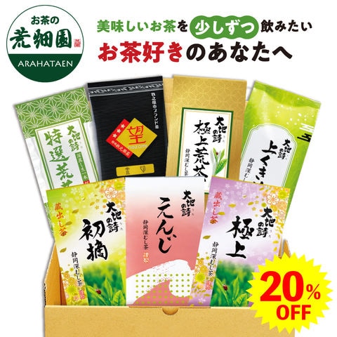 内容:極上蔵出し茶100g×1袋、初摘蔵出し茶100g×1袋、えんじ100g×1袋、極上荒茶100g×1袋、上くき茶200g×1袋、特選荒茶150g×1袋、望金印100g×1袋