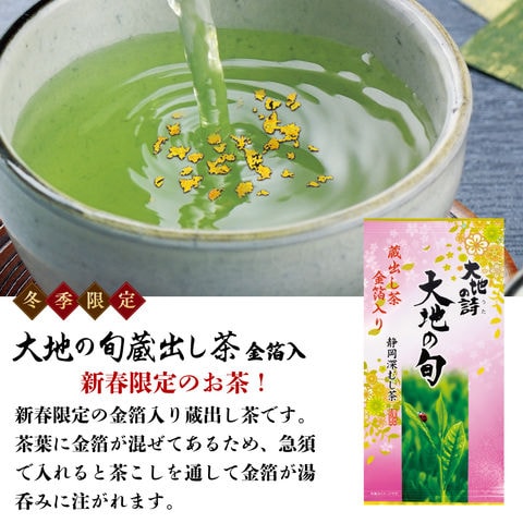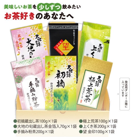 内容:初摘蔵出し茶100g×1袋、大地の旬蔵出し茶金箔入70g×1袋、手摘み粉茶200g×1袋、極上荒茶100g×1袋、上くき茶200g×1袋、望金印100g×1袋