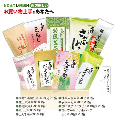内容:大地の旬蔵出し茶100g×1袋、極上荒茶100g×1袋、特選荒茶150g×1袋、えんじ100g×1袋、上くき茶200g×1袋、抹茶入玄米茶200g×1袋、手摘み粉茶200g×1袋、さわやかパック(5g×30ヶ入)×1袋、さんさんほうじ茶パック(2g×50ヶ)×1袋
