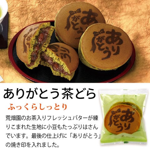 原材料名:【新茶 初摘】緑茶(静岡県産)、【ありがとう茶どら】砂糖(国内製造)、小豆、鶏卵、小麦粉、バター、水飴、蜂蜜、酒、醤油(大豆由来)、緑茶、/膨張剤(一部に卵、小麦、乳製品を含む)