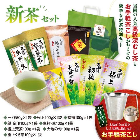 当園の人気高級深むし茶とお手軽茶こしがおまけの豪華な新茶特別セット!