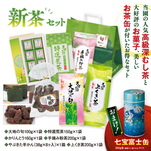 当園の人気高級深むし茶と大好評のお菓子、美しいお茶缶が付いたお得なセット!