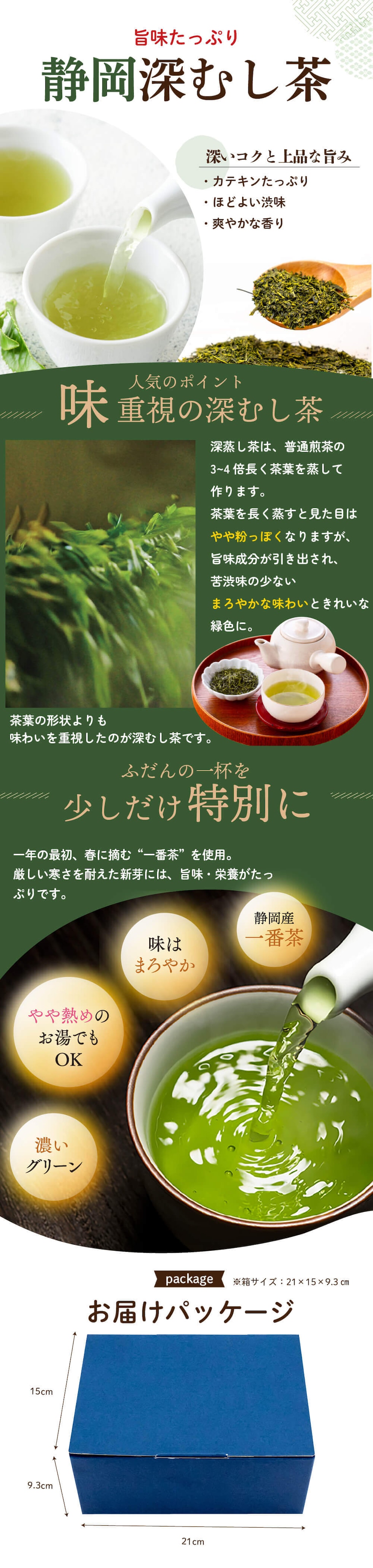 【静岡産「深蒸し茶」】 味重視の深蒸し茶!普通煎茶の3〜4倍長く茶葉を蒸して作る深蒸し茶。茶葉はやや粉っぽくなりますが、旨味成分が引き出され、苦渋味の少ないまろやかな味わいが楽しめます。