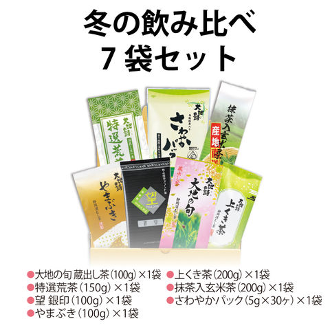 【内容】大地の旬蔵出し茶(100g入)×1袋、特選荒茶(150g入)×1袋、望銀印(100g入)×1袋、やまぶき(100g入)×1袋、上くき茶(200g入)×1袋、抹茶入玄米茶(200g入)×1袋、さわやかパック(5g×30ケ入)×1袋