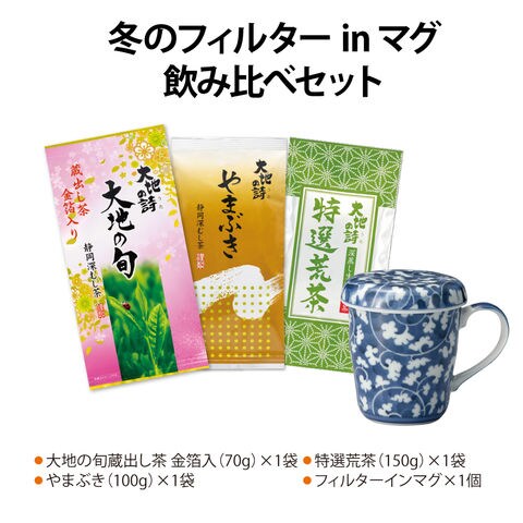 【内容】大地の旬蔵出し茶金箔入70g×1袋、やまぶき100g×1袋、特選荒茶150g×1袋、フィルターインマグ×1個 【原材料名】緑茶(静岡県産)