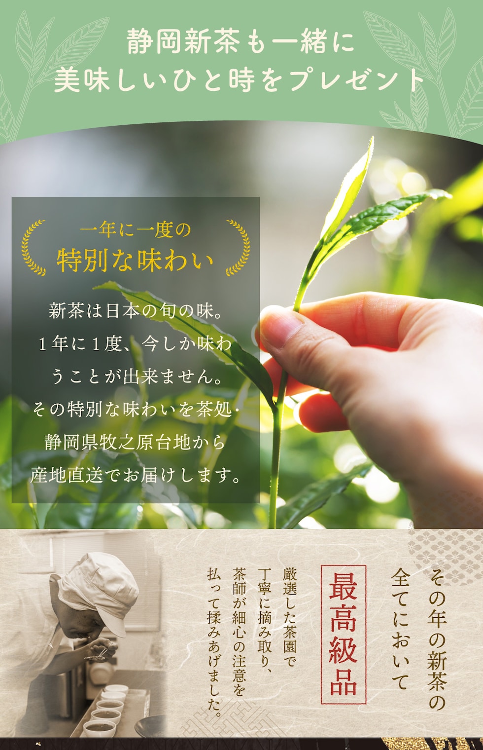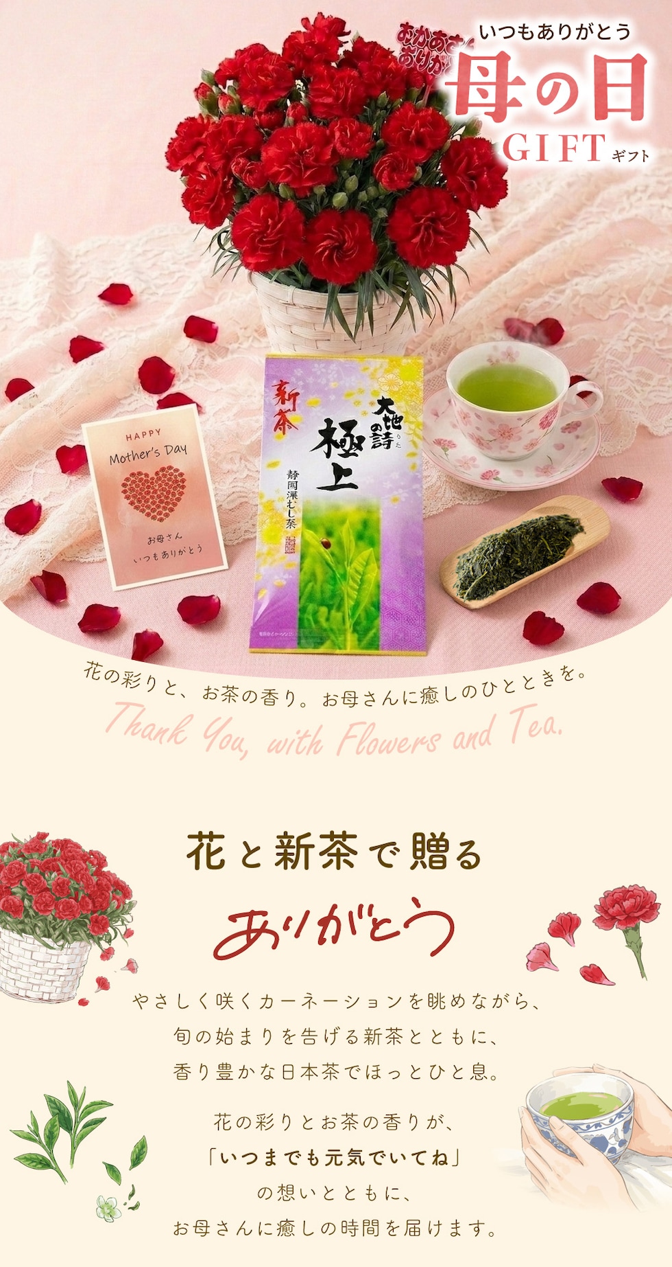 やさしく咲くカーネーションを眺めながら、旬の始まりを告げる新茶とともに、香り豊かな日本茶でほっとひと息。花の彩りとお茶の香りが、「いつまでも元気でいてね」の想いとともに、お母さんに癒しの時間を届けます。