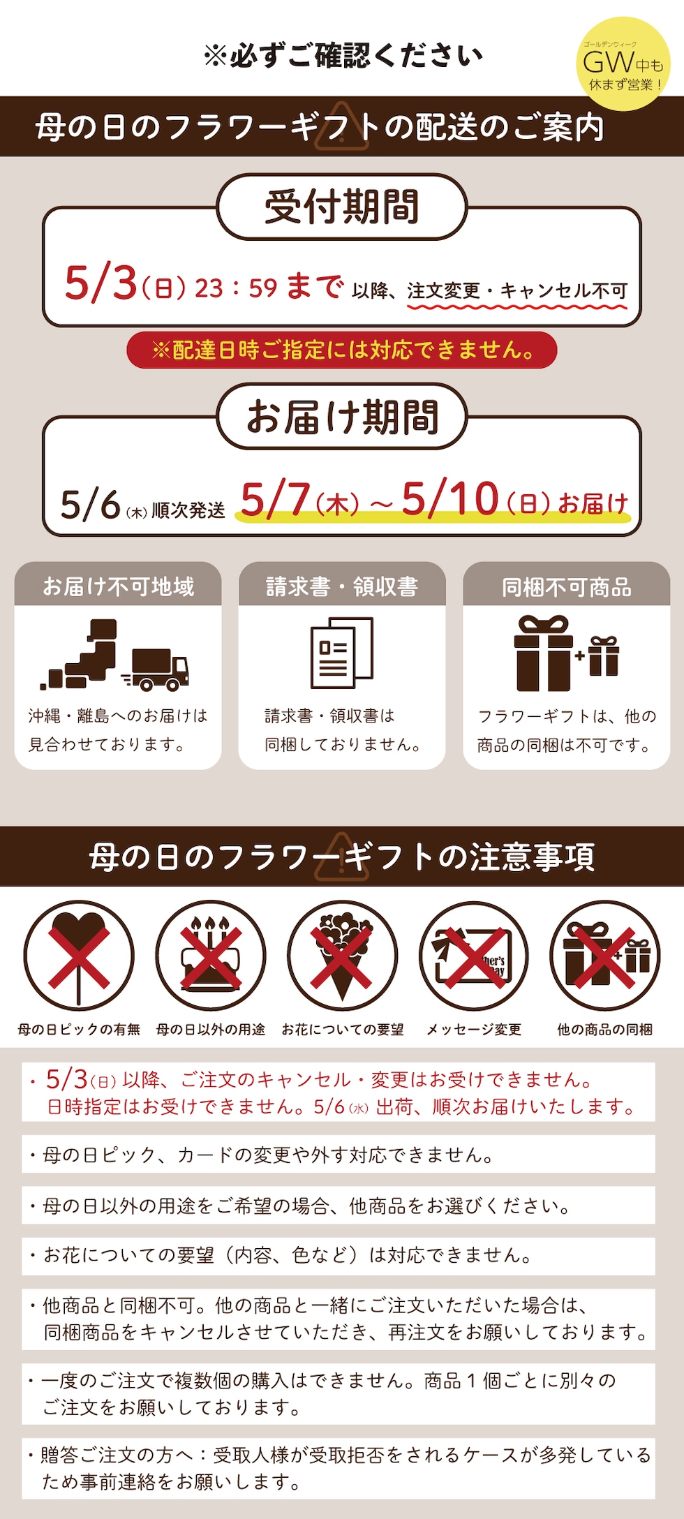 ・商品特性上、配送に時間がかかる沖縄県・離島へのお届けは見合わせております。