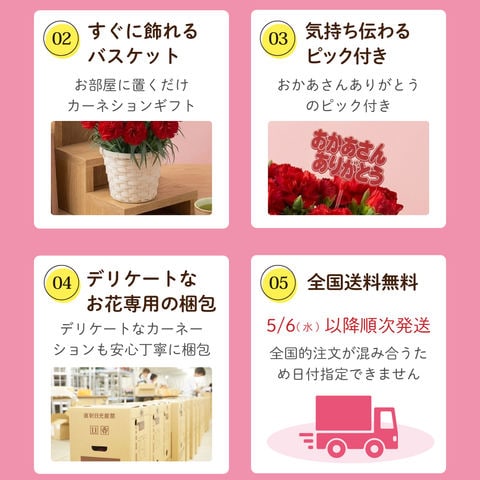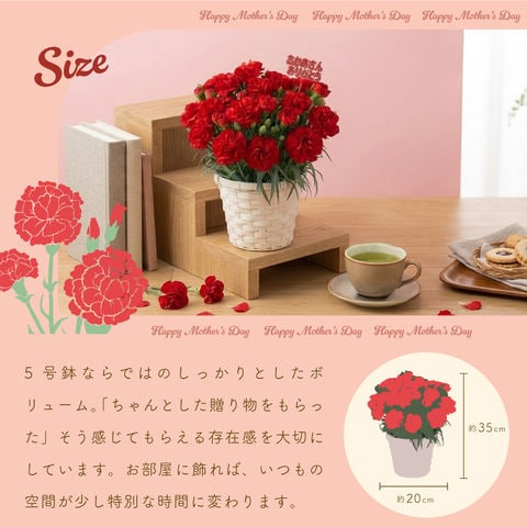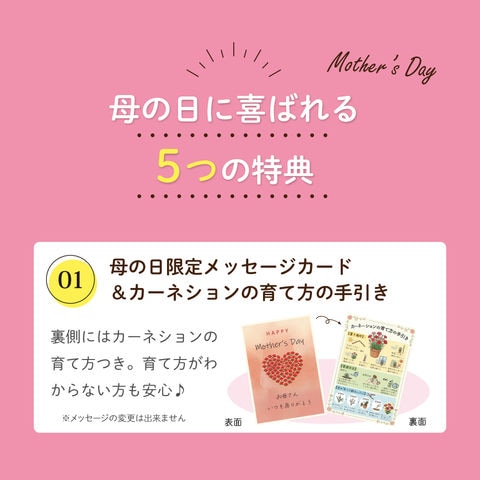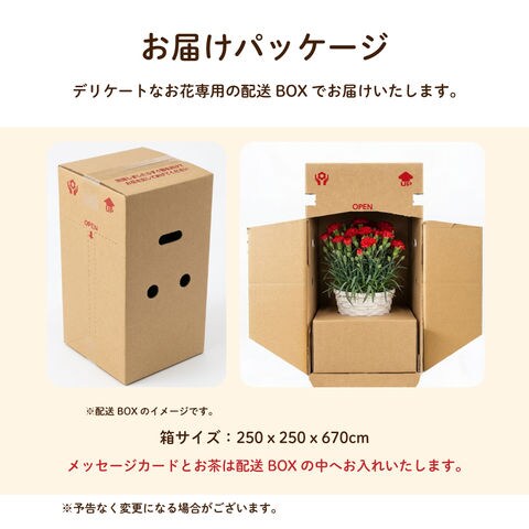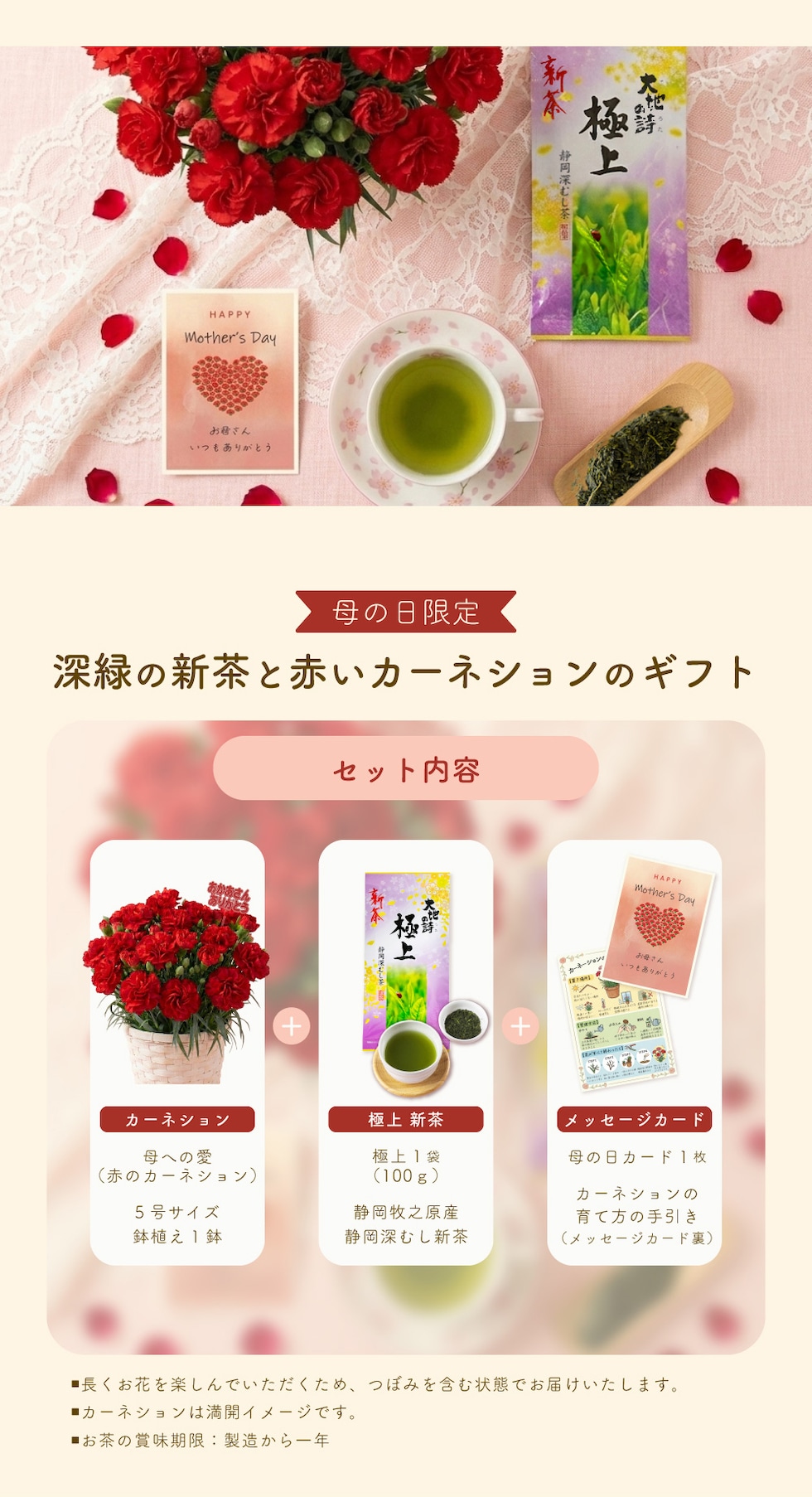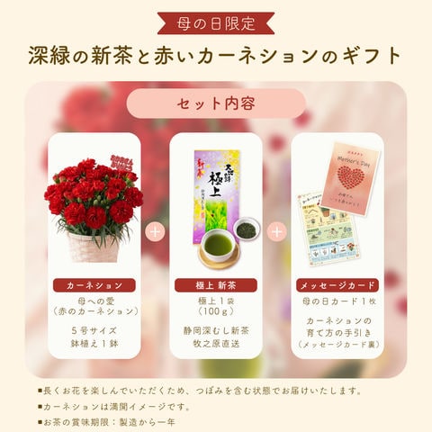 内容量:静岡深むし茶100g×1袋、カーネーション5号サイズ鉢植え1鉢、母の日限定メッセージカード&カーネションの育て方の手引き×1枚