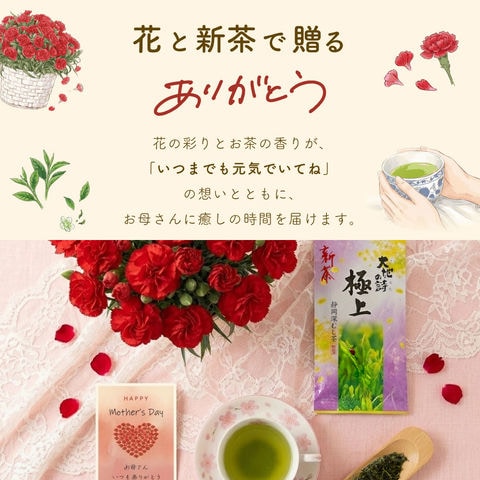 母の日は、お母さんに感謝の気持ちを込めて、深緑の新茶と赤いカーネションのギフトを贈りませんか?