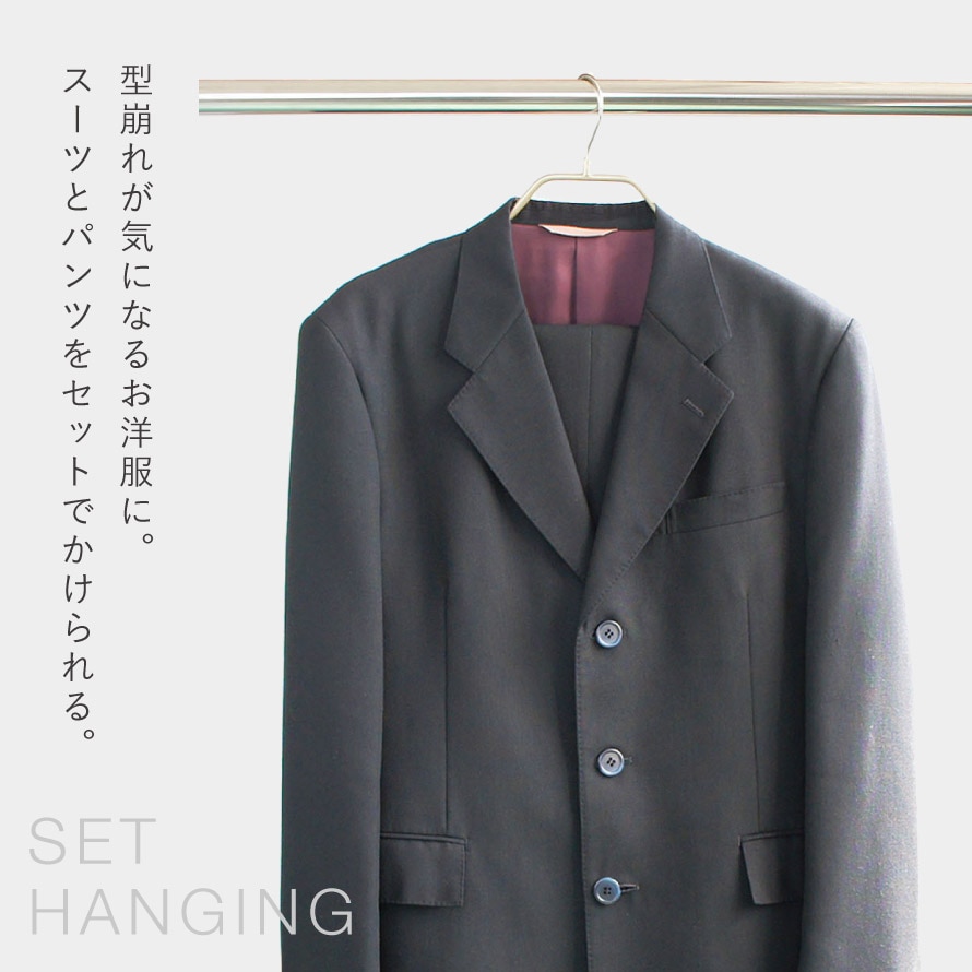 スーツなど型崩れが気になるお洋服に。スーツとパンツをセットでかけられるハンガーです。