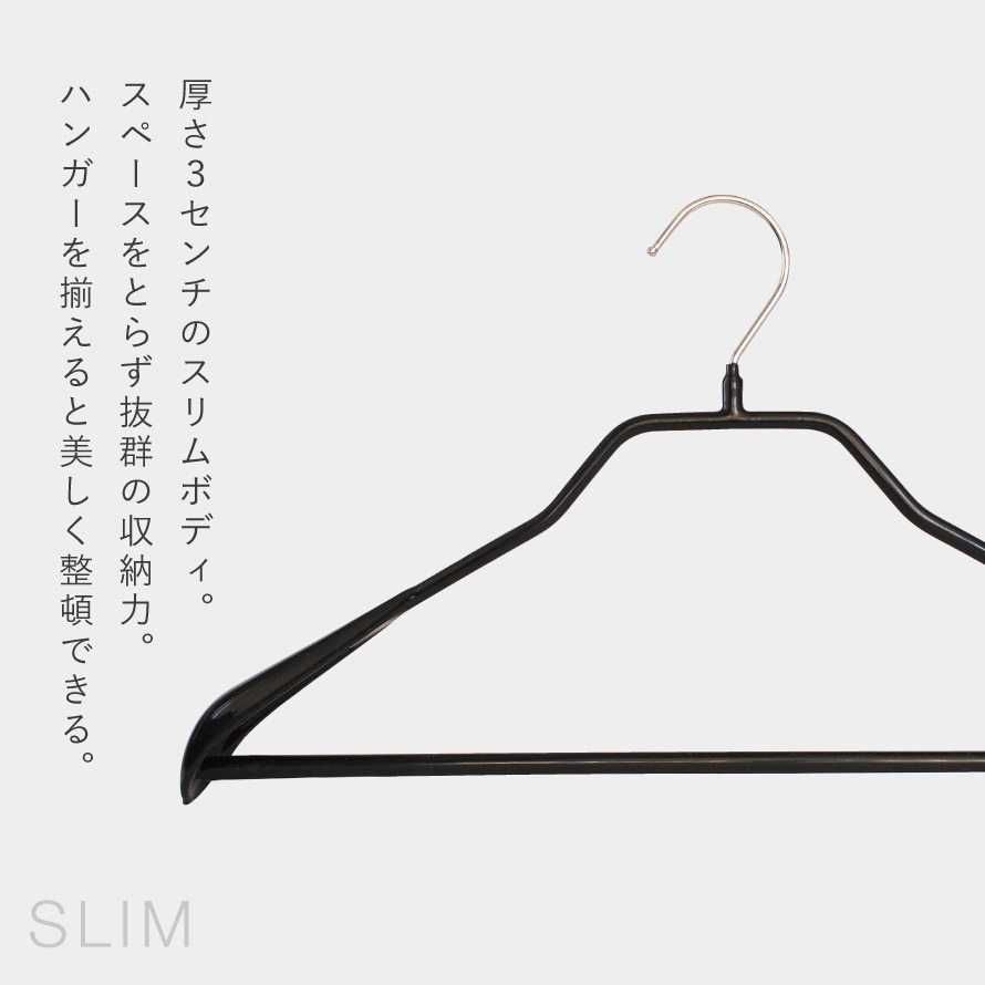 スリムなボディで、たくさんの衣類の整理に最適。クローゼットなどでもスペースをとらず抜群の収納力。ハンガーを統一する事で肩のラインが並び、見た目もすっきりして素敵に美しく整頓できます。