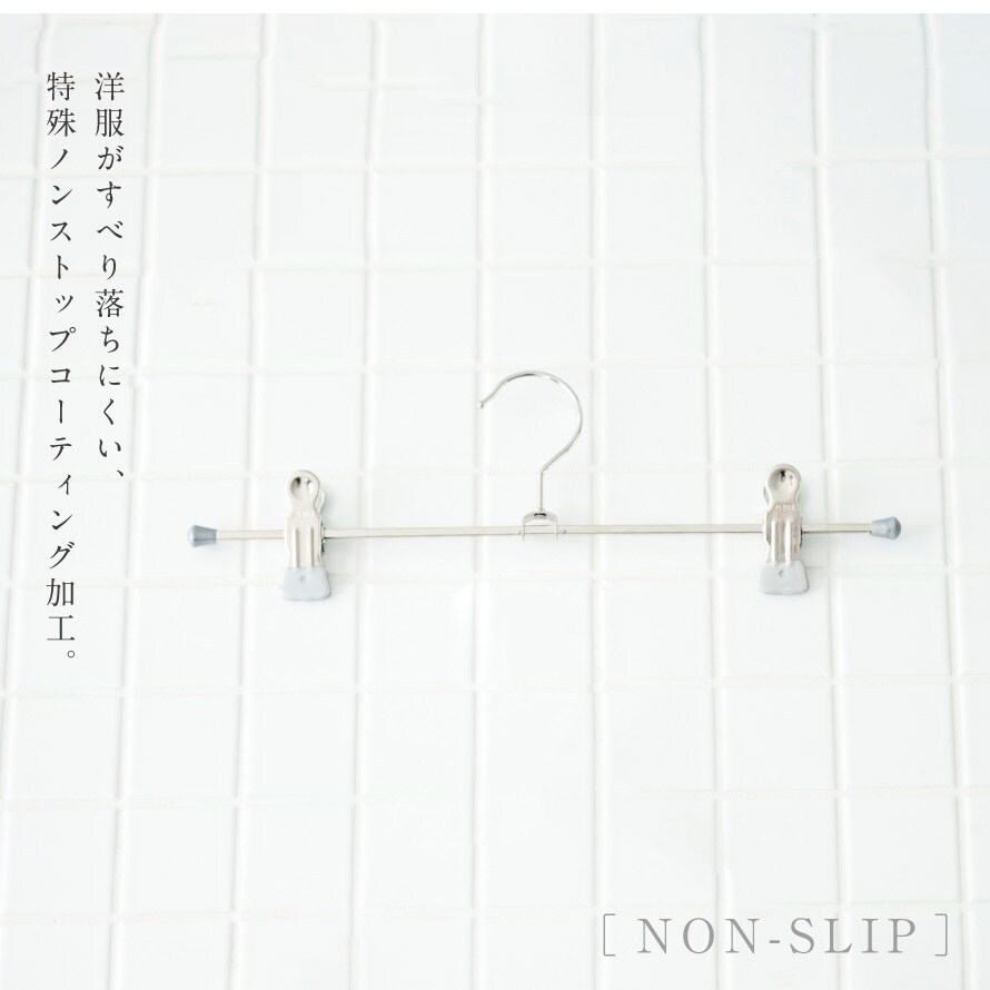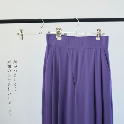 洋服がすべり落ちにくい、特殊ノンストップコーティング加工。挟んでも滑り落ちやすいスカートなどの収納も安心。