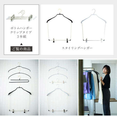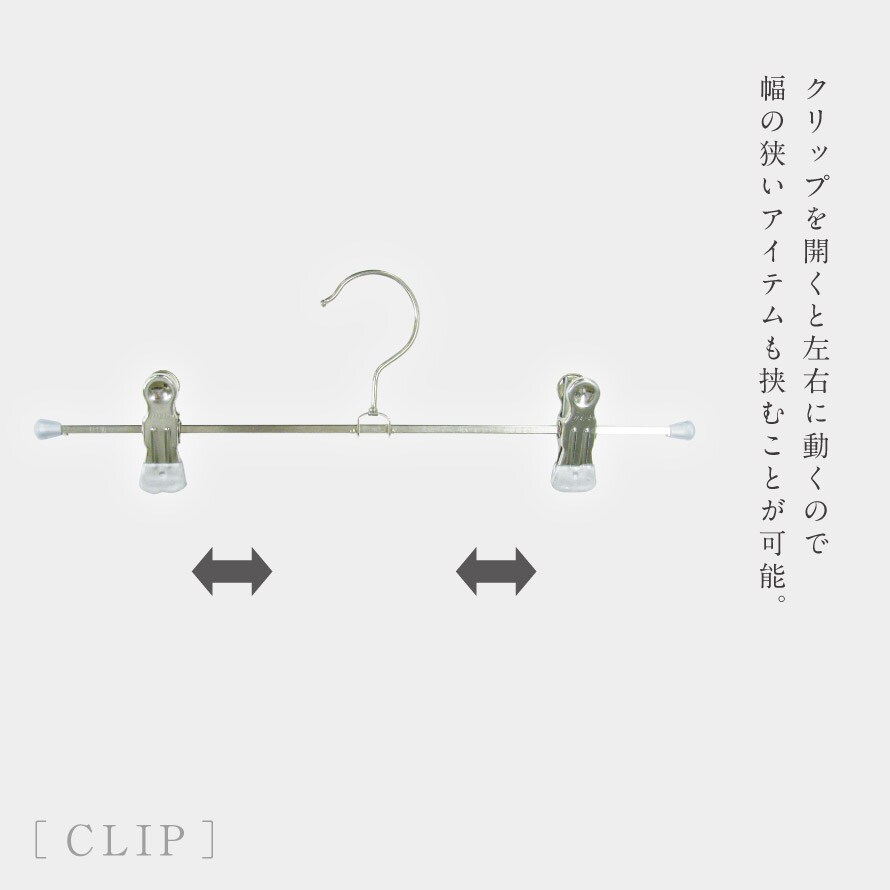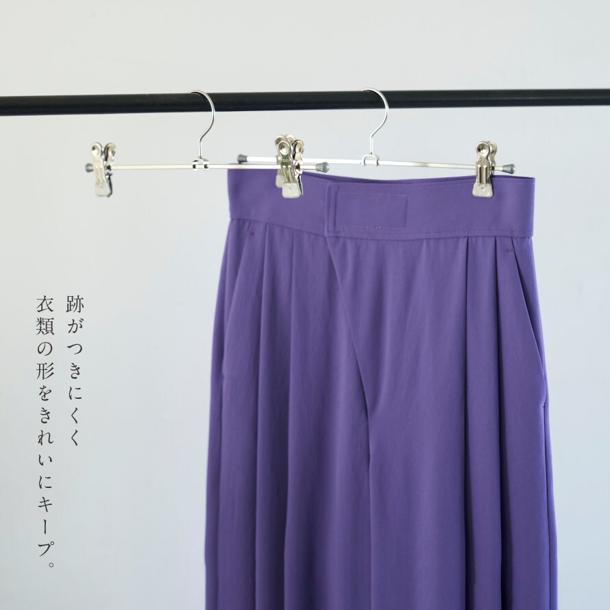 「ボトムハンガー クリップタイプ」は、しわのでやすい素材など吊るしてかけられるのが特徴です。ピンチが左右におごくのでいろんなサイズに対応します。