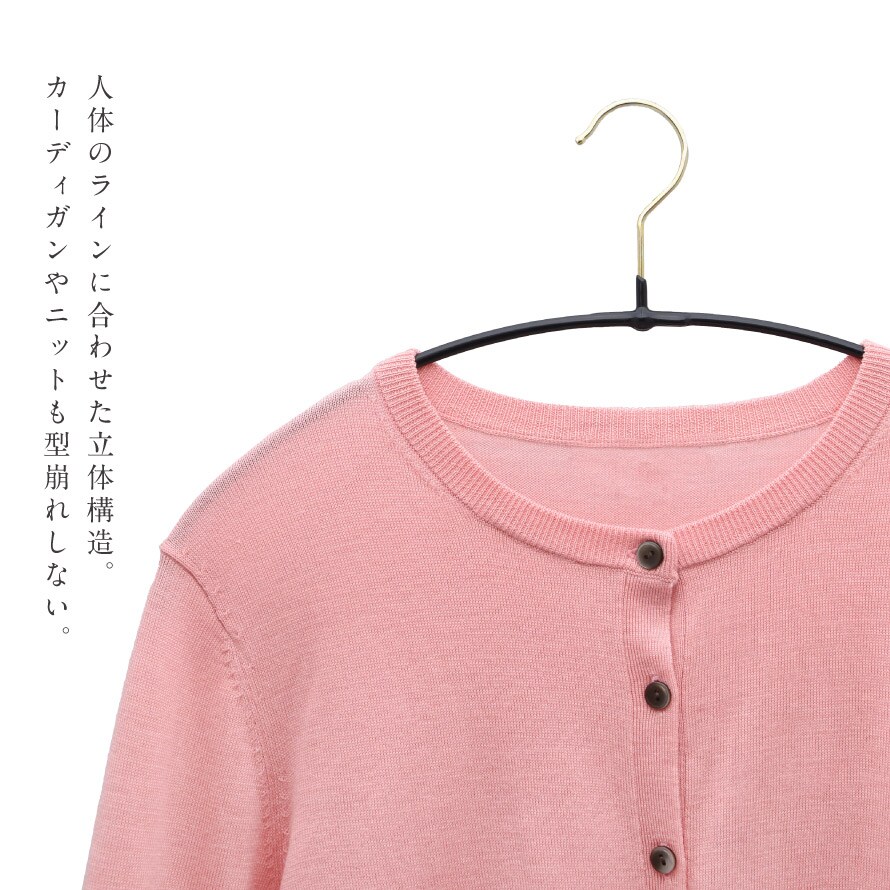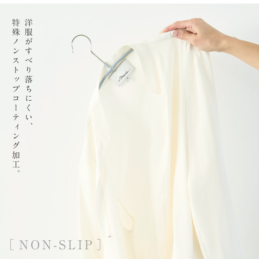 洋服がすべり落ちにくい、特殊ノンストップコーティング加工。人体のラインに合わせた立体構造で、滑り落ちやすいカーディガンやニットも型崩れなく収納可能。キャミソールやワンピースもしっかりかけることができます。