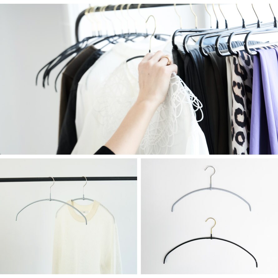 洋服がすべらずスリムなボディのドイツ製ハンガー「MAWA」の良さを生かしつつ、スタイリストならではの視点で発案されたハンガーは、クローゼットにもお洋服にも優しい。