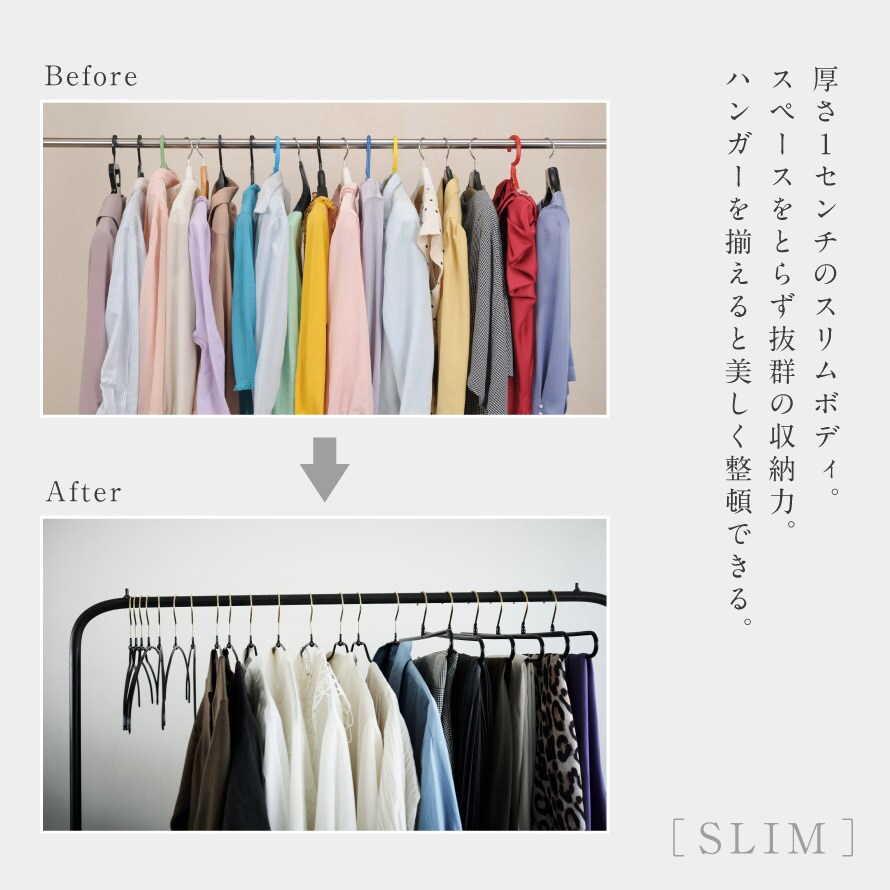 クローゼットなどでもスペースをとらず抜群の収納力。ハンガーを統一する事で高さのラインが並び、見た目もすっきりして素敵に美しく整頓できます。