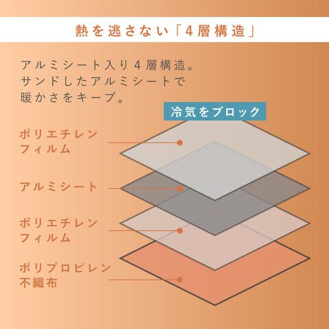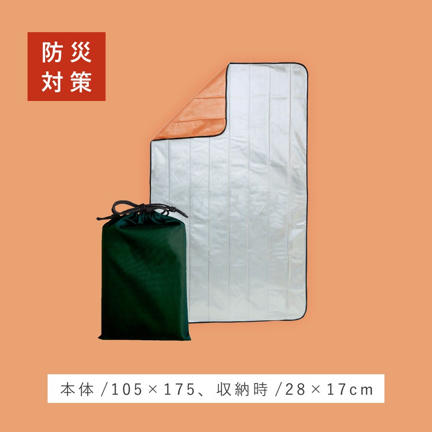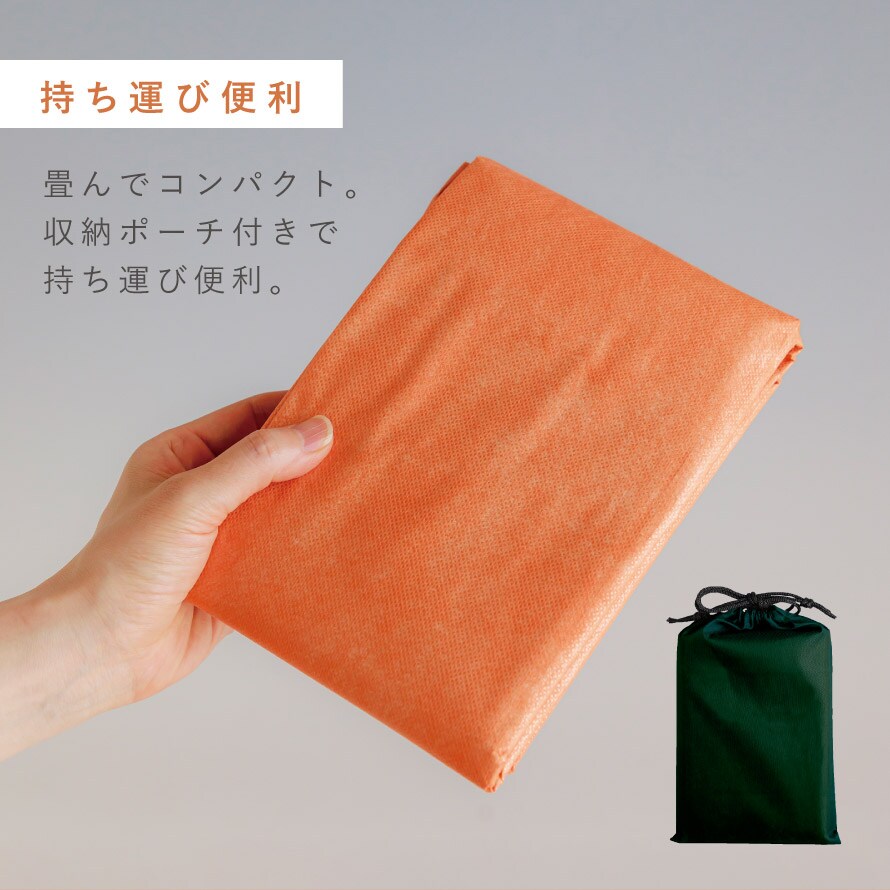| 材質 | 本体表面/アルミ蒸着ポリエチレン、本体裏面/ポリプロピレン不織布、収納ポーチ/ポリエステル100% |
