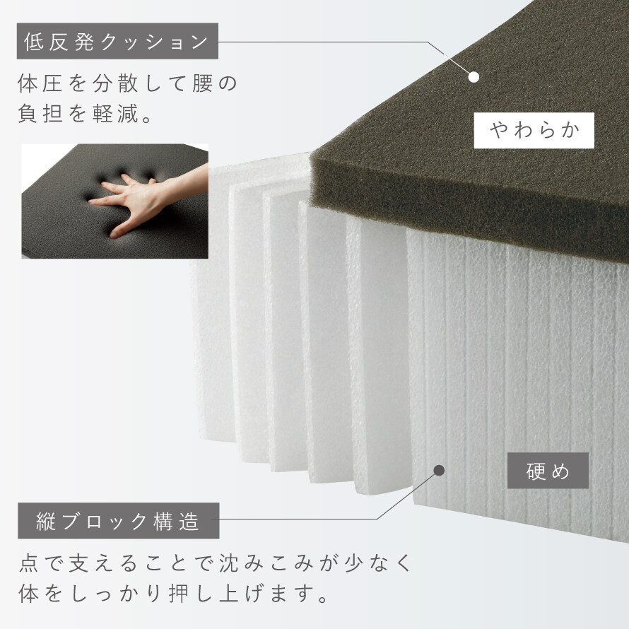縦型ブロック構造が沈み込みを抑え、へたりにくく体をしっかり支えます。