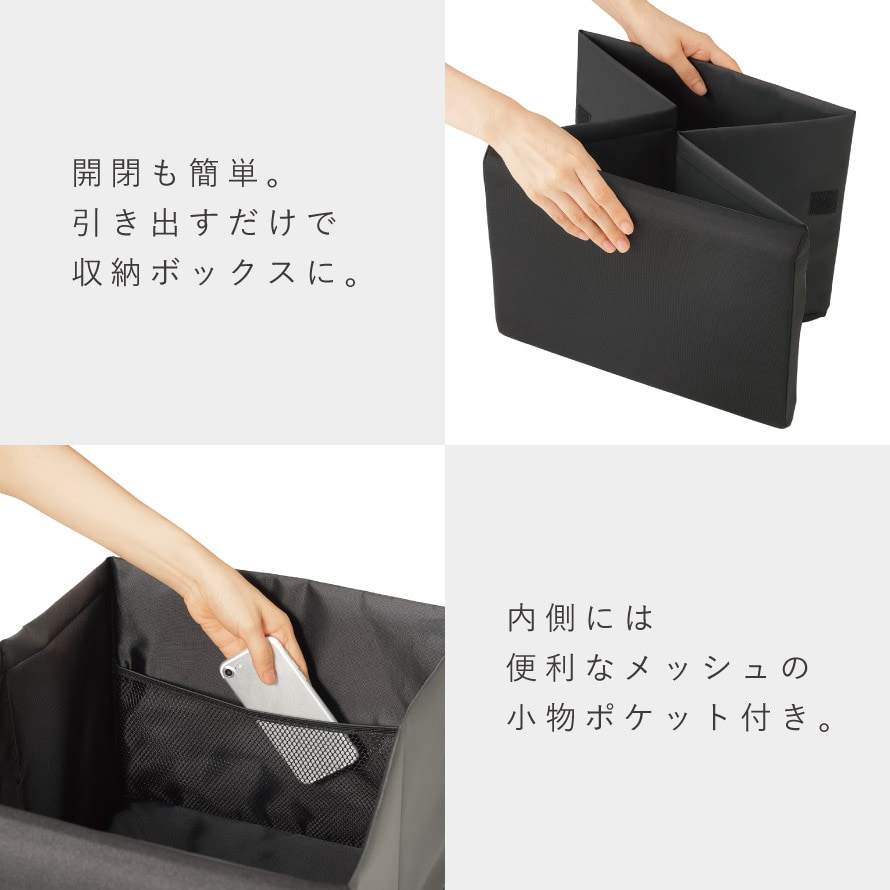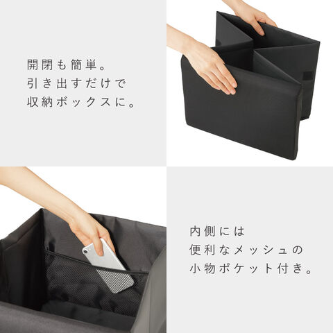 ストッパーをシートに差し込むだけの簡単取付。畳んでいるときはクッション、引き出すと収納ボックスに早変わり。