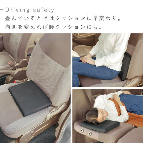 助手席、後部座席にセットして普段は腰クッションとして使用したり、向きを変えればシートクッションでも使用できます。