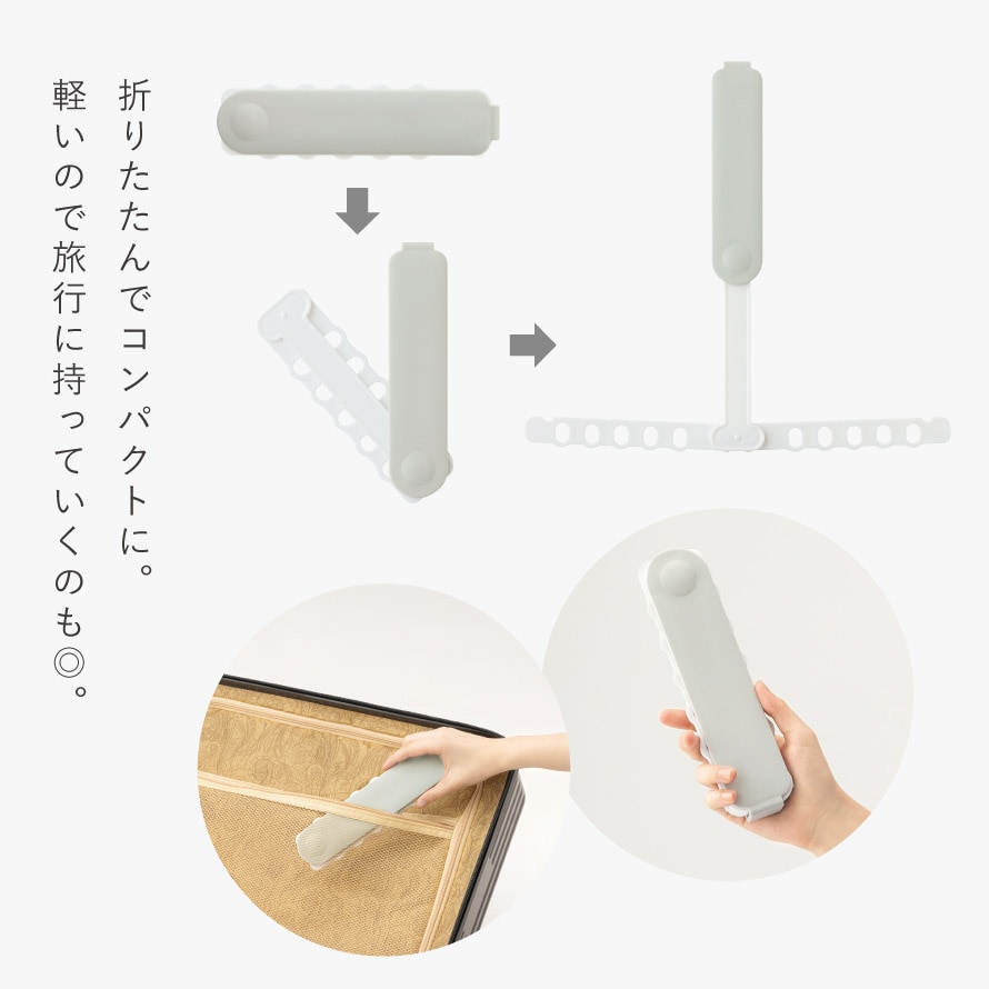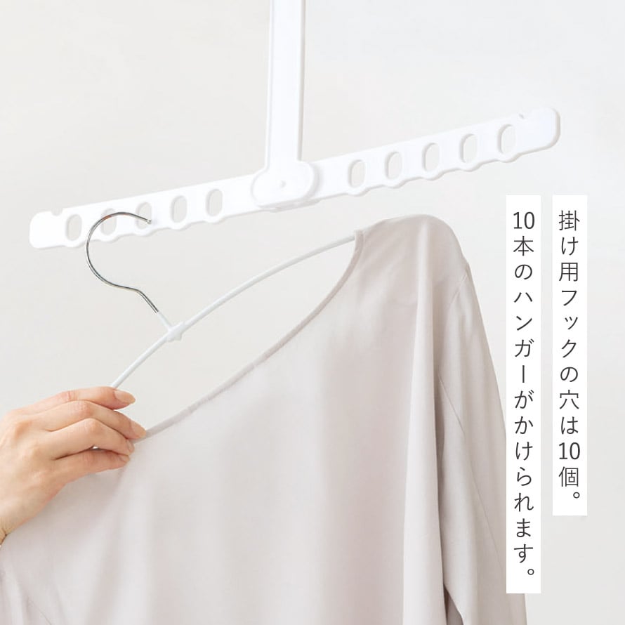 掛け用フックの穴は10個。10本のハンガーがかけられます。フック部分は折りたたんでコンパクトに。軽いので旅行に持っていくのも◎。