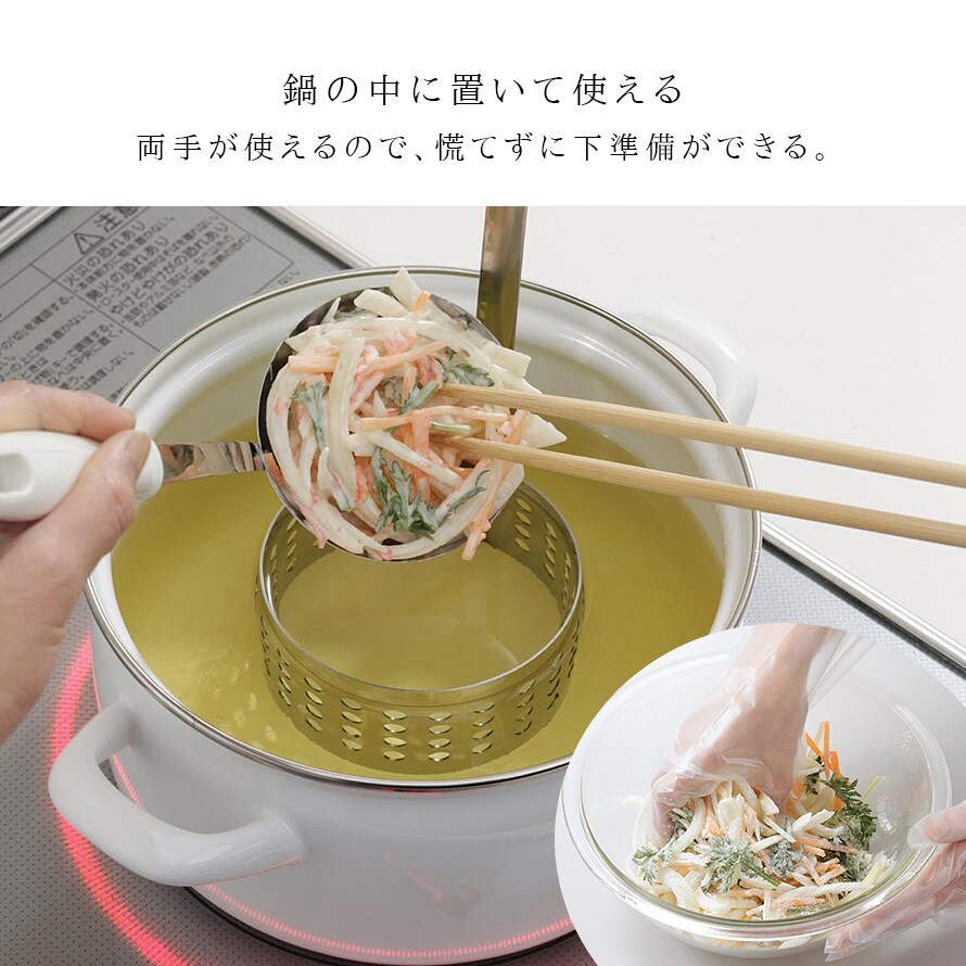 鍋の中に置けるので両手が使え、慌てずに下準備ができる嬉しいポイントも。
