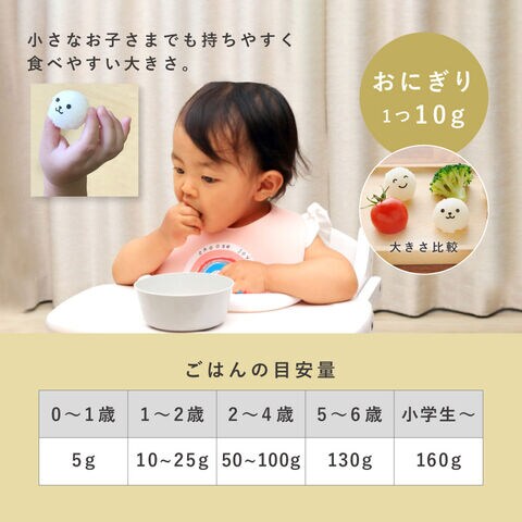 おにぎり1個あたり約10gのひとくちサイズで、小さなお子さまでも持ちやすく食べやすい大きさ。食べる量の調節がしやすく、離乳食後期~幼児食にもぴったりです。