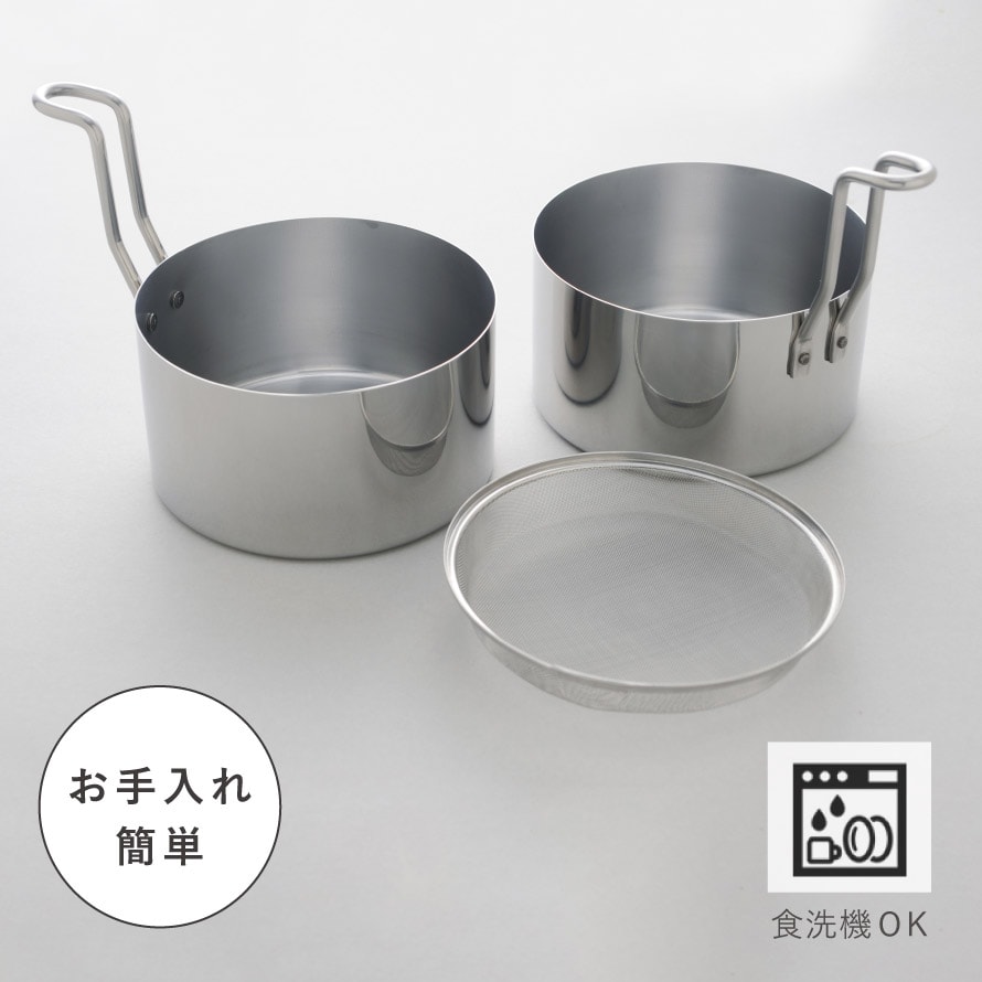 付属の網皿は、揚げ物の油切りと油のろ過を兼ねた仕様で、よりきれいに油を使いたいときはキッチンペーパーを敷いて使うことも可能。油の処理が面倒になりがちな毎日の揚げ物も、無理なく続けられます。素材には丈夫で耐熱性・耐食性に優れたステンレスを使用し、金属加工の産地として有名な新潟県燕三条で製造された、日本製ならではの安心品質。