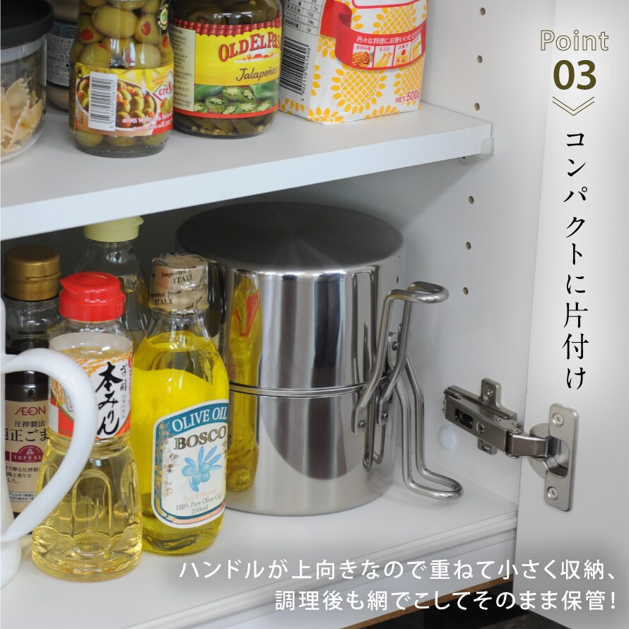 ハンドルが上を向いているので調理中や油ポットとして使用した時、場所を取らず、使う油の量も少なくて済み経済的です。