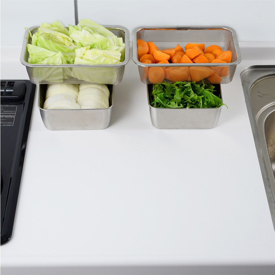 使わない時はコンパクトに収納できる、角型ザルセット深型タイプ。