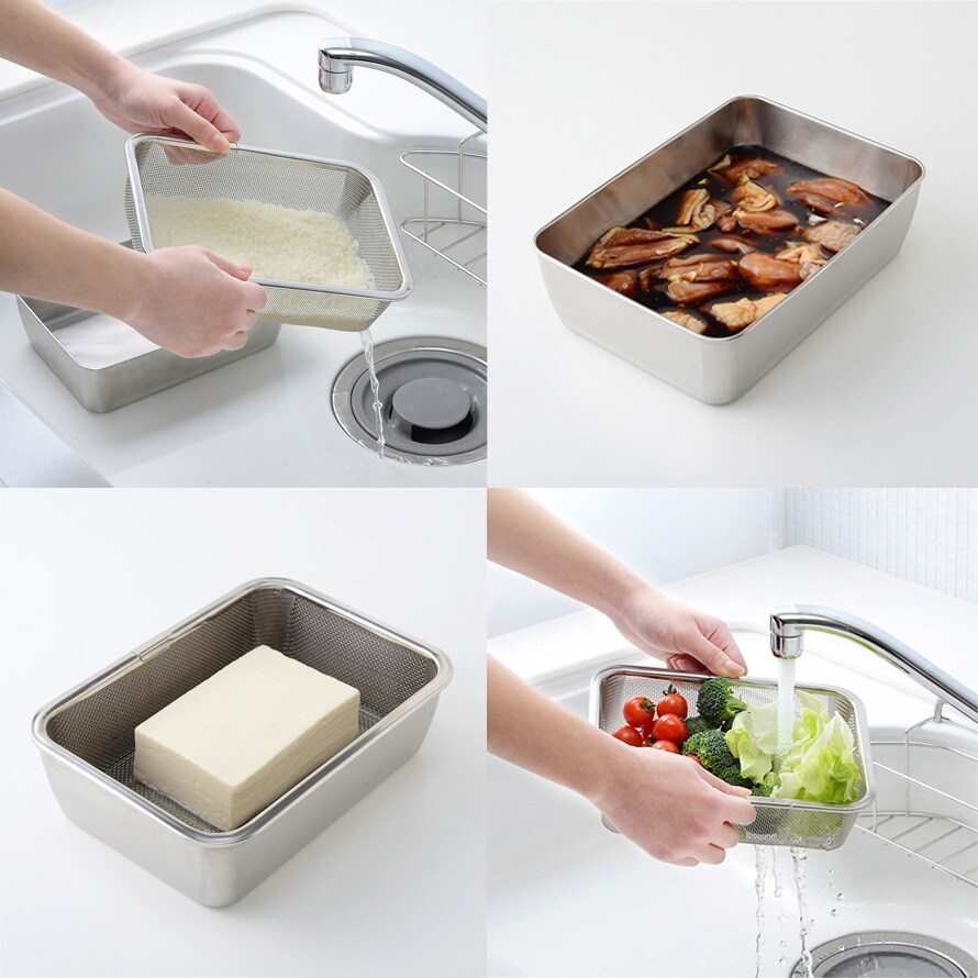 耐食性・耐久性に優れているステンレスバットとザルに収納に便利な蓋をセットした、蓋付きステンレスバット2個と角型ザル2個のセット。