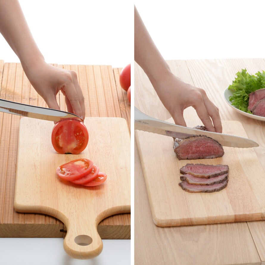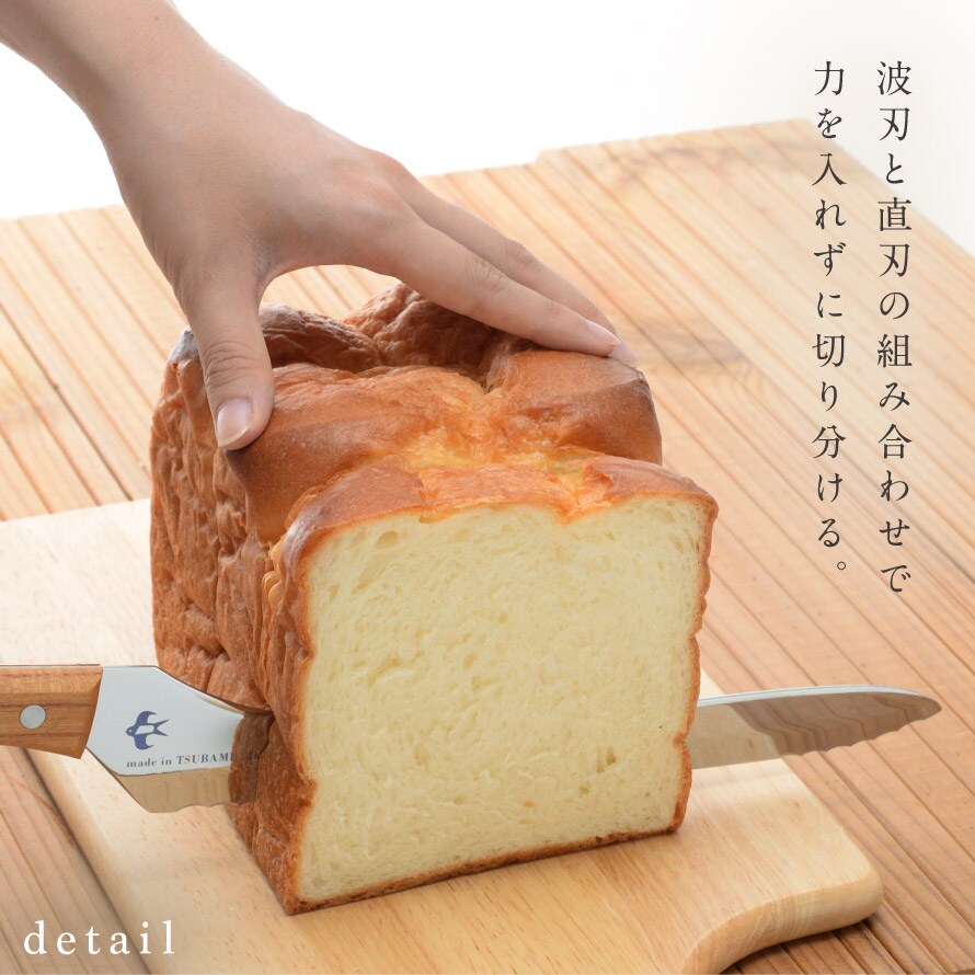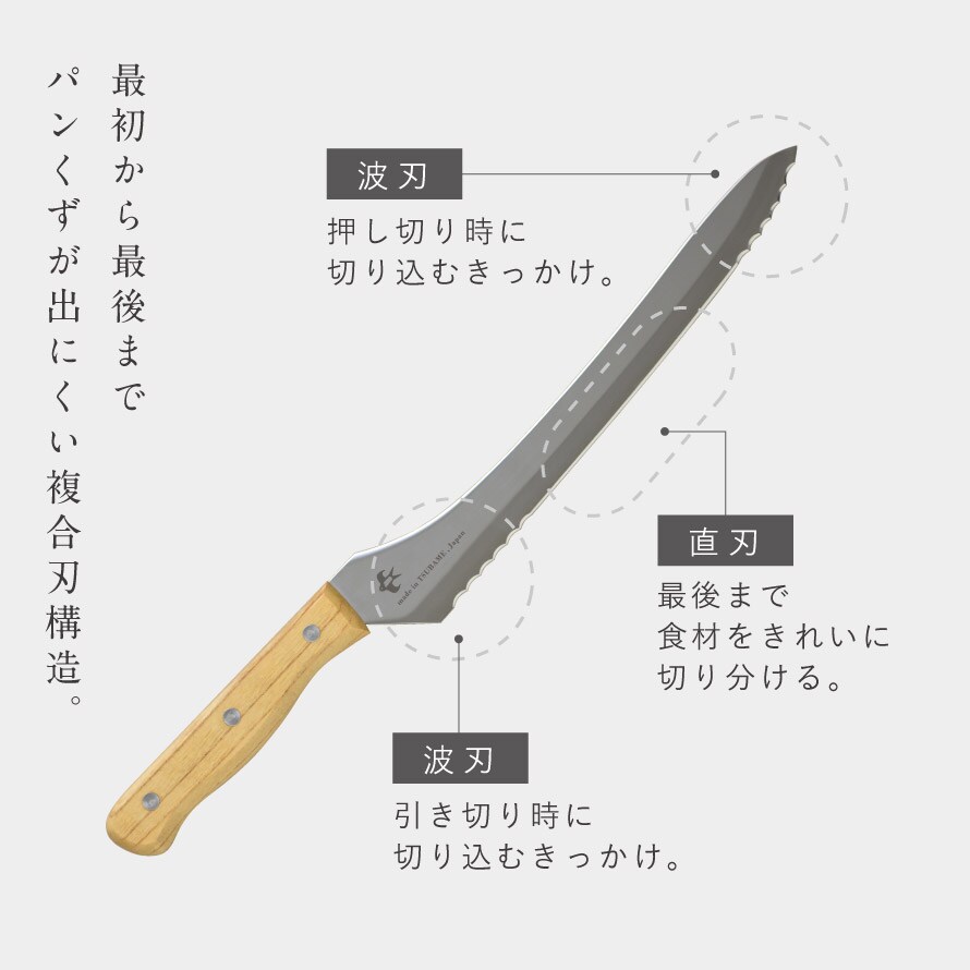 波刃と直刃の2種類の刃の組み合わせにより、パンの切りくずを抑えながらきれいに切り分けられます。波刃のきっかけにより硬いフランスパンも力が入らずに、潰れやすい柔らかい食パンも簡単に切れます。