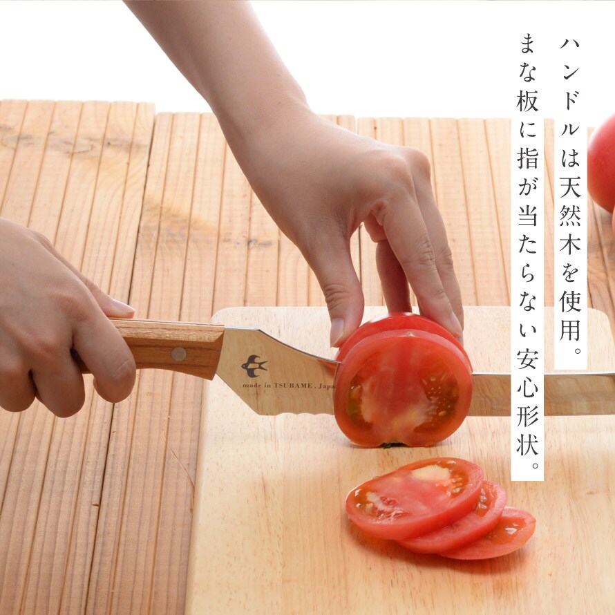 天然木のケヤキを使用し、手になじむ背通しハンドル。握りやすく、まな板に指が当らない安心形状です。