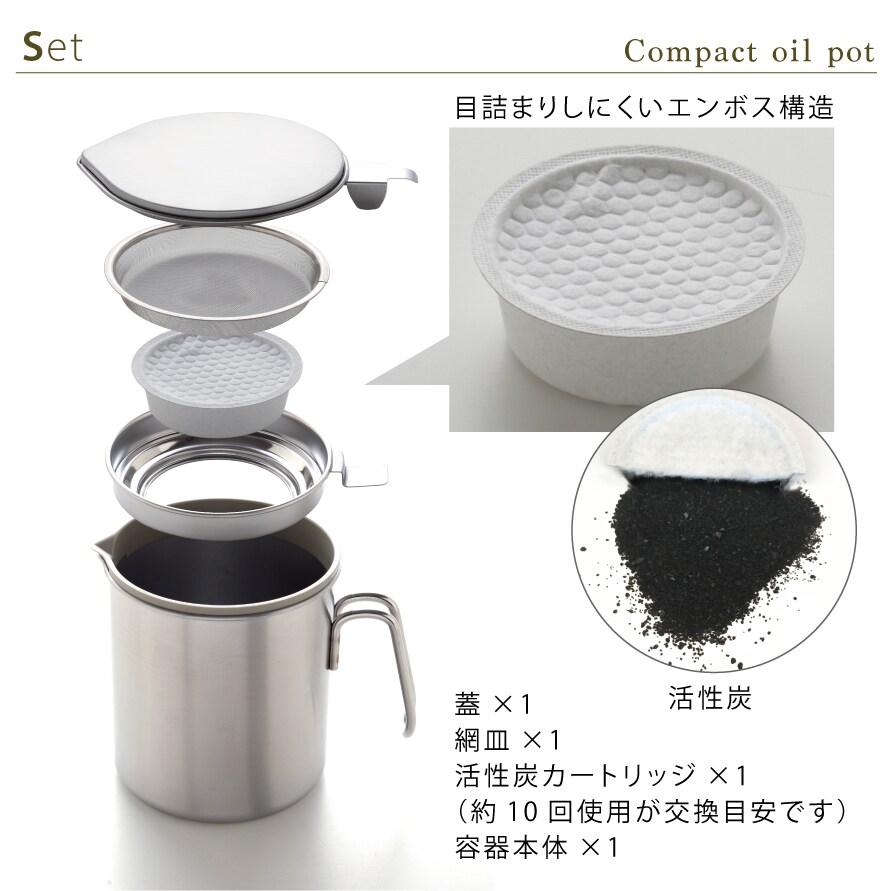 | 材質 | 本体/ステンレス鋼、66ナイロン(耐熱温度/180度)、網皿、ろ過器、蓋/ステンレス鋼、活性炭カートリッジ/木質系活性炭、布、不織布(レーヨン) |