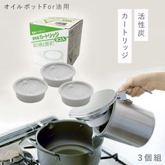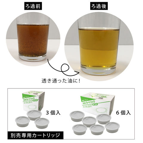 活性炭カートリッジ式。不織布フィルターが網皿で取りきれない揚げカスなどをキャッチし、活性炭フィルターが細かい不純物や臭い分子を強力吸収します。
