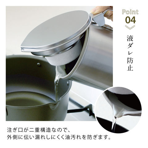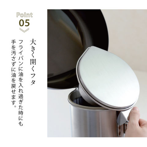 蓋の開口部が大きく開くため、フライパンの油を入れすぎた時など手を離さずにそのまま油を戻すこともできます。