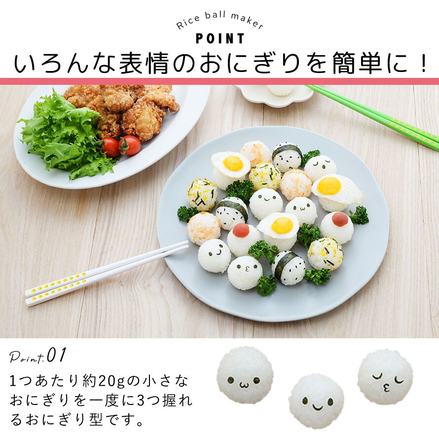 1つあたり約20gの小さなおにぎりが一度に3つ握れるおにぎり型と、海苔パンチ2個のセット。