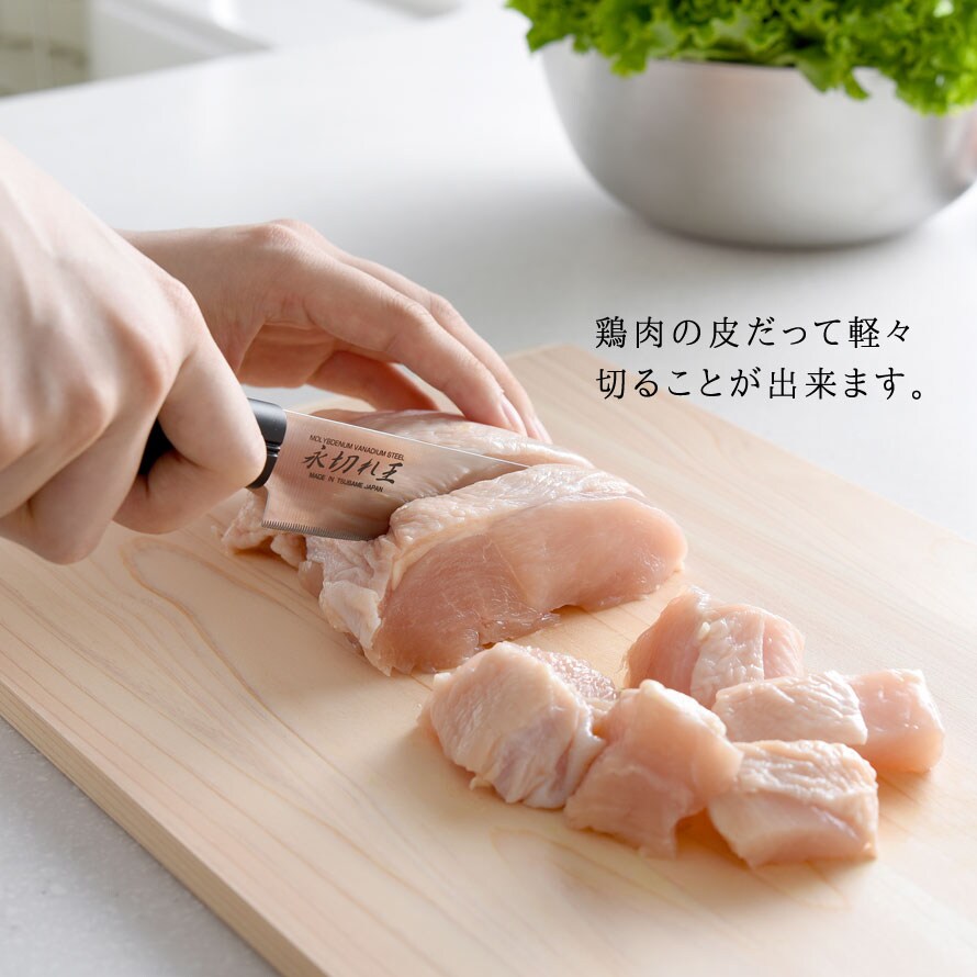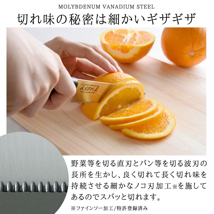 直刃と波刃の長所を生かし、良く切れて長く切れ味を持続させる細かなノコ刃加工(ファインソー加工/特許登録済み)を施した特殊刃で魚もバラ肉もスパッと切れます。