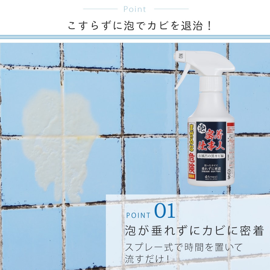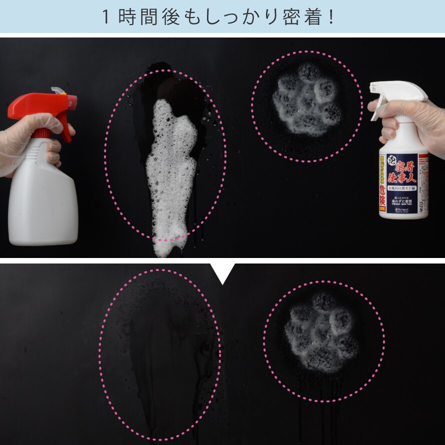 濃密な泡が、狙った黒カビにピタッと密着!一般的な洗剤と違い、1時間経っても垂れずに黒カビに密着してお掃除します。